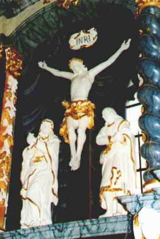 Im Zentrum des Hauptgeschosses befindet sich eine freiplastische Kreuzigungsgruppe mit Maria und Johannes.