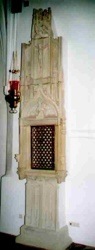 gegenüberliegenden Seite, dort wo die Meßdiener sitzen, aus der mittelalterlichen Kirche. Entsprechend seiner Bedeutung ist es abschließbar, reich verziert und ist um das Jahr 1500 hergestellt worden. Es ist